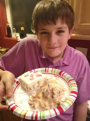 Today was Benjamin's Birthday. He's 12!!!! How did that happen? We had stayed up late working on his "cake" and I had to work early. So, in order to keep the tradition of streamers on the door going, I asked Katie for help. I usually just tape streamers going every which way. Not so much with Katie. She very methodically hung them. She did a fantastic job!